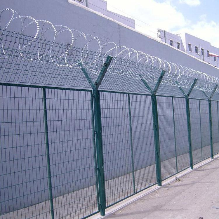 監(jiān)獄護(hù)欄網(wǎng)又稱作“Y型安全防御護(hù)網(wǎng)”和機(jī)場(chǎng)護(hù)欄網(wǎng)通用,是由V型支架立柱,加強(qiáng)型焊接片網(wǎng),安全防盜連接件和熱鍍鋅刀片刺籠組成強(qiáng)度和安全防御性級(jí)別很高。近年來,被廣泛應(yīng)用在監(jiān)獄,軍事基地等高安全場(chǎng)所。注:如果在監(jiān)獄護(hù)欄網(wǎng)頂部加裝刀片刺絲、刀片刺繩后又很好的增強(qiáng)了安全防護(hù)性能。采用電鍍、熱鍍、噴塑、浸塑等防腐形式,具有很好的抗老化、抗曬、耐候等特點(diǎn)。其產(chǎn)品造型美觀、花色多樣,既起到圍欄作用,又起到美化作用。由于具有安全性高、防攀爬能力好,網(wǎng)片連接方式采用特制SBS緊扣件,有效防止人為的破壞性拆卸,橫向四道折彎加強(qiáng)筋,使網(wǎng)面強(qiáng)度顯著增加。
